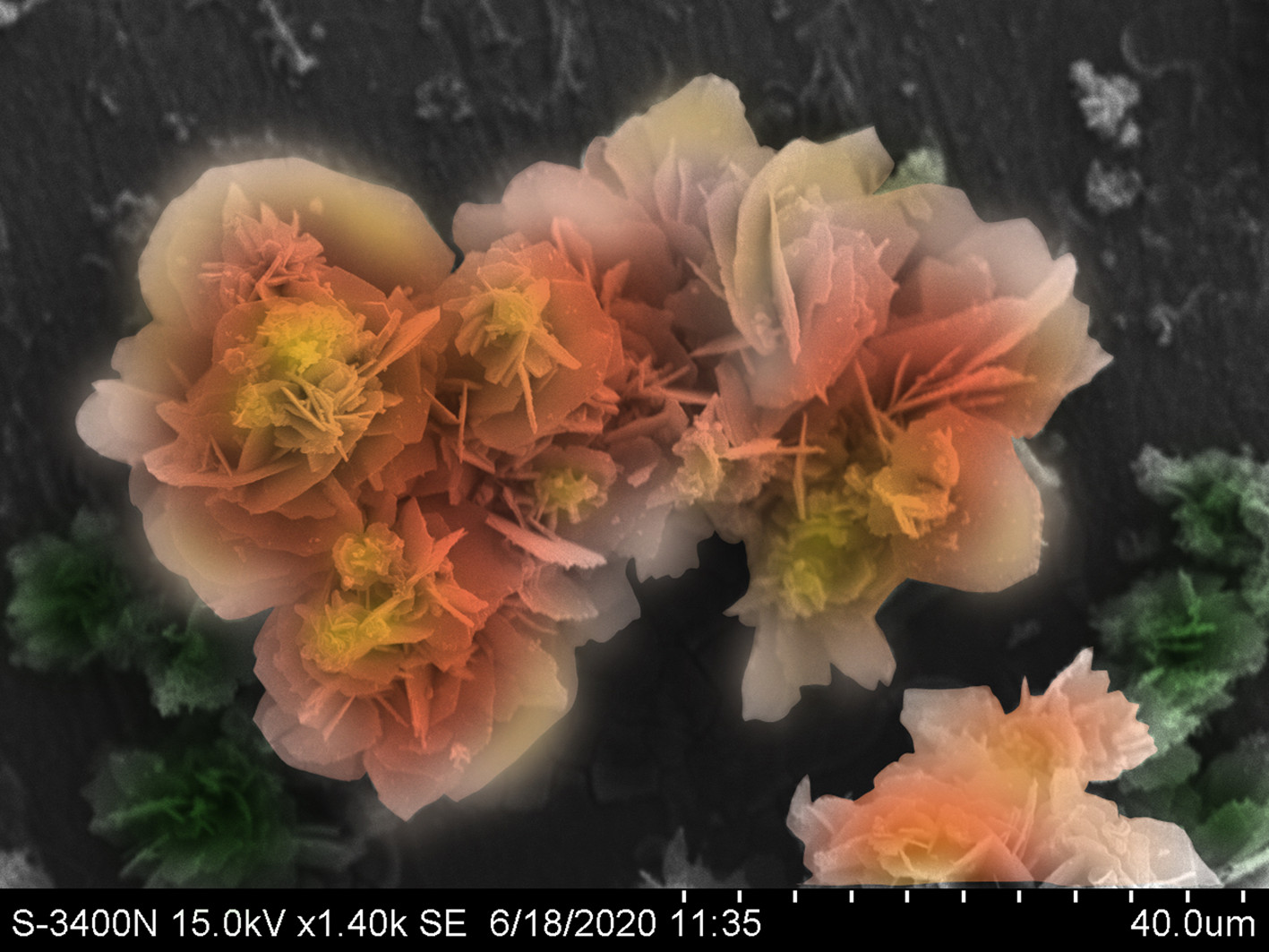 將Q235碳鋼浸泡在3.5%NaCl+少量緩蝕劑溶液里,得到鐵的腐蝕產(chǎn)物,在電子顯微鏡中放大1400倍拍攝碳鋼表面腐蝕后的形貌。表達(dá)出錚錚鐵骨也有柔情似水的一面,有了水的滋潤(rùn),氧氣的幫助,鐵塊上便能綻放出最美的花朵。
