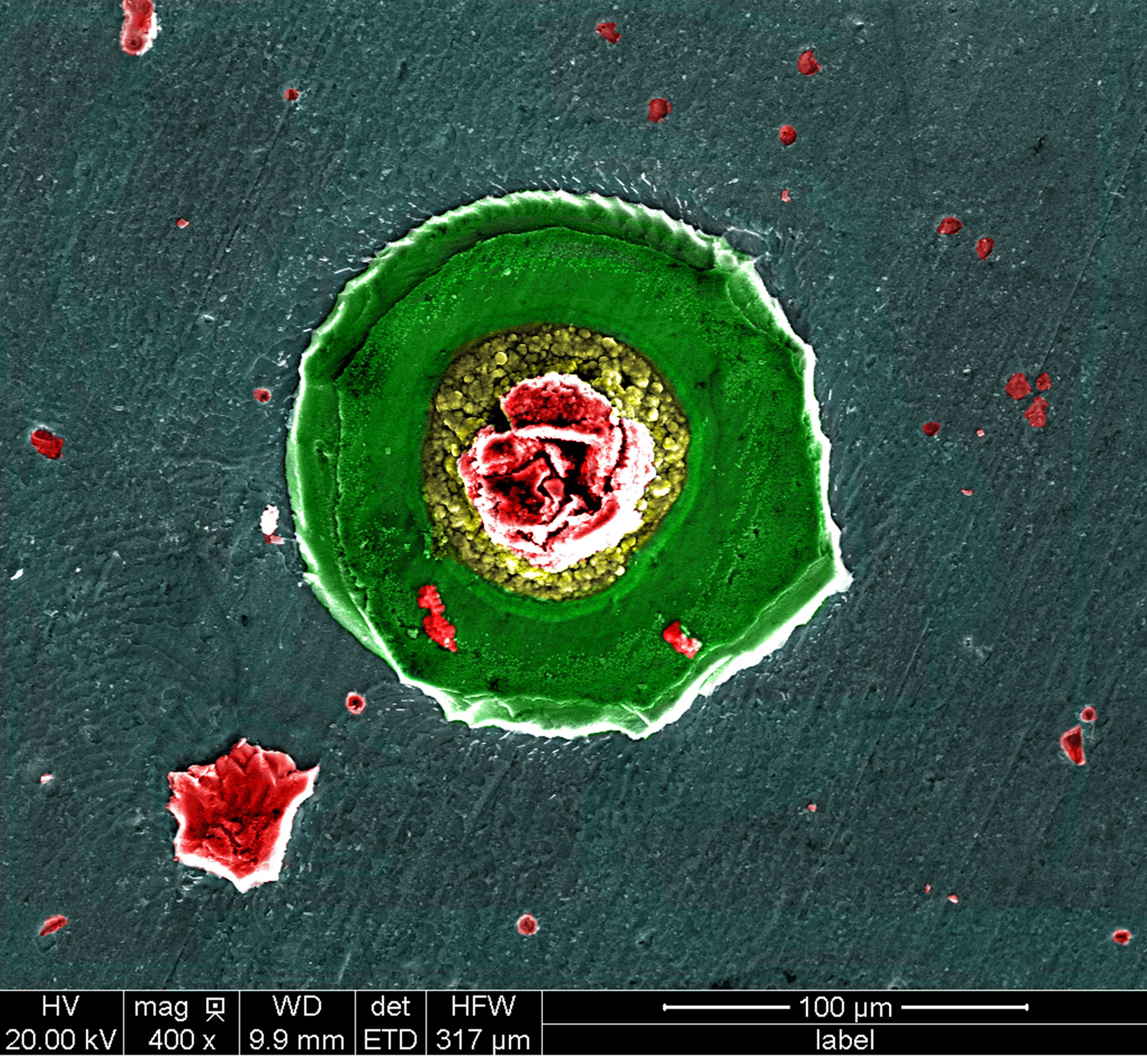 在TC4鈦合金基底上,利用磁控濺射真空鍍膜TiAl金屬間化合物,經(jīng)過700度真空燒結(jié)熱處理后偶然發(fā)現(xiàn)的表面缺陷,最后簡(jiǎn)單上色得到圖片,紅色飄零的玫瑰,落在綠色的芙蕖上,藍(lán)色背底恰如青年公園的小湖,風(fēng)波蕩漾美輪美奐。