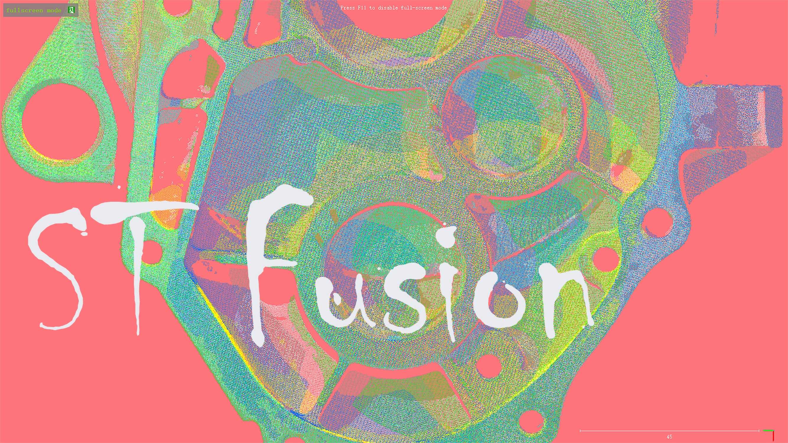 使用搭建的多投影儀結(jié)構(gòu)光系統(tǒng)對(duì)發(fā)動(dòng)機(jī)的HDR表面多角度掃描,使用補(bǔ)償算法實(shí)現(xiàn)了三維表面的魯棒重建和多點(diǎn)云無特征無迭代的精確配準(zhǔn),通過點(diǎn)云融合的色彩斑斕體現(xiàn)現(xiàn)代平面設(shè)計(jì)藝術(shù)。