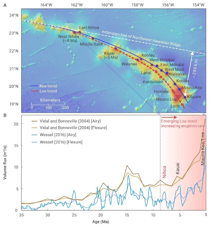 夏威夷-帝王海山鏈?zhǔn)枪腆w地球科學(xué)的經(jīng)典研究對(duì)象,在板塊構(gòu)造理論和地幔柱假說的發(fā)展過程中起到了舉足輕重的作用。根據(jù)板塊構(gòu)造理論和地幔柱假說,地幔柱保持基本不動(dòng),而板塊運(yùn)動(dòng),因此地幔柱噴發(fā)形成的火山在板塊上留下成串的火山。最近800萬年以來,夏威夷海山鏈開始分叉為兩條近似平行的火山鏈,并出現(xiàn)偏轉(zhuǎn)。夏威夷地幔柱經(jīng)歷了超過8500萬年的噴發(fā),巖漿噴發(fā)速率自800萬年以來開始急劇增加,目前每年噴發(fā)量達(dá)到0.6立方千米(全球地幔柱平均噴發(fā)量為2立方千米)。