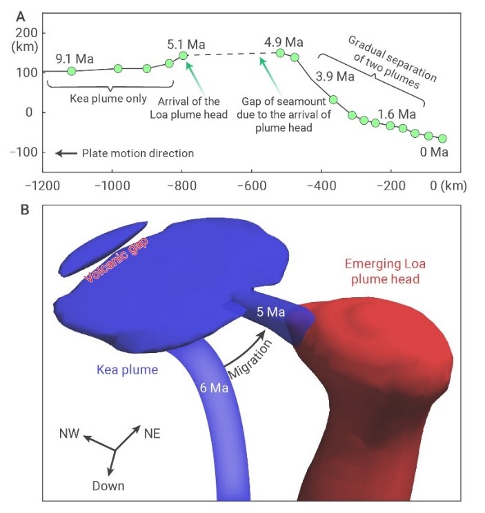 中科院海洋所孫衛(wèi)東團(tuán)隊(duì)與美國伊利諾伊大學(xué)香檳分校劉麗軍教授團(tuán)隊(duì)合作,通過地球化學(xué)和地球動(dòng)力學(xué)模擬,論證了古老的夏威夷地幔柱尾在800萬年前開始受到新生地幔柱頭影響,研究成果3月8日在國際學(xué)術(shù)期刊The Innovation上正式發(fā)表。