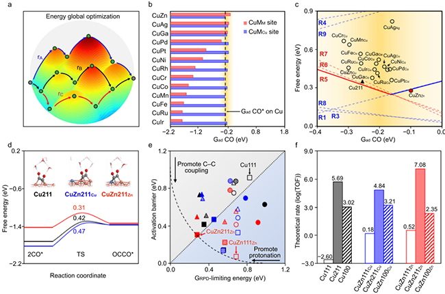 本工作中,肖建平團(tuán)隊(duì)基于自主開發(fā)的圖論和反應(yīng)相圖分析算法(ACS Catal.,2021),根據(jù)全局能量最優(yōu)準(zhǔn)則篩選出活性曲線頂點(diǎn)的CuZn合金催化劑,并預(yù)測(cè)其具有增加C2+產(chǎn)物選擇性的潛力。實(shí)驗(yàn)制備的納米多孔Cu0.9Zn0.1高選擇性催化劑在弱酸性(pH=4)電解質(zhì)中C2+單程產(chǎn)率為31 2%,CO2單程利用率超過80%。該催化劑提供了豐富的CuZnZn和CuZnCu位點(diǎn),具有不對(duì)稱的CO吸附能,對(duì)于提高CO2的電催化轉(zhuǎn)化至關(guān)重要。研究發(fā)現(xiàn),CO在鋅上的吸附比銅弱,將CuZn合金化可使表面二元位點(diǎn)具備不對(duì)稱的CO吸附能力,從而提高C-C偶聯(lián)反應(yīng)活性,有效促進(jìn)CO2到C2+的還原。