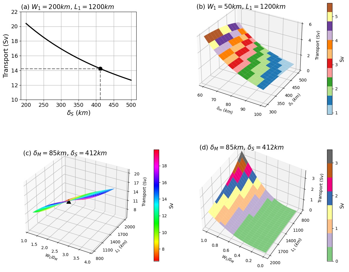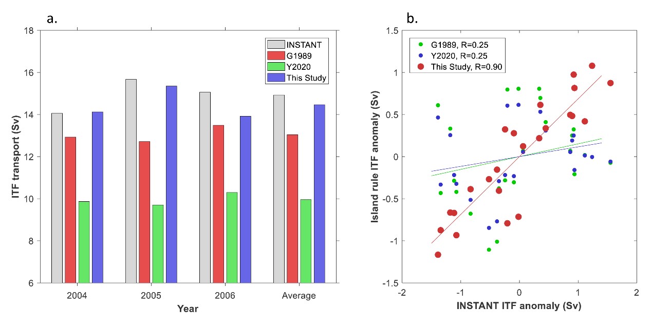 團(tuán)隊(duì)基于所得到的三島嶼繞島環(huán)流解析解,估算了印尼貫穿流的體積輸運(yùn)并與INSTANT觀測、MITF等觀測時間序列以及前人的理論值進(jìn)行了對比。結(jié)果表明該三島嶼繞島環(huán)流理論可以很好地再現(xiàn)印尼貫穿流體積輸運(yùn)的平均值和年際變化,相較于原始的Godfrey繞島環(huán)流理論具有明顯的進(jìn)步。研究團(tuán)隊(duì)進(jìn)一步基于該解析解開展了敏感性試驗(yàn),研究了島嶼分布、海峽通道尺寸、摩擦邊界層厚度等因素變化對多島嶼繞島環(huán)流框架下印尼貫穿流輸運(yùn)估計(jì)的影響,得到了一些有意義的結(jié)果。
