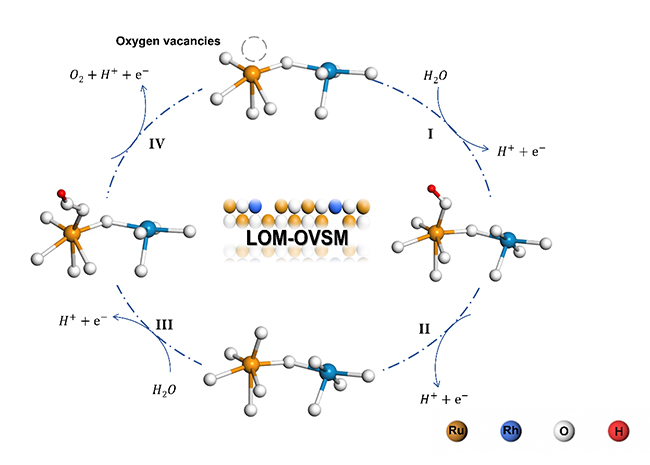 近日,中國科學(xué)院大連化學(xué)物理研究所催化國家重點實驗室二維材料化學(xué)與能源應(yīng)用研究組研究員吳忠?guī)泩F隊與理論催化創(chuàng)新特區(qū)研究組研究員肖建平團隊合作,在電催化水氧化催化劑設(shè)計和機理解析研究方面取得新進展。合作團隊發(fā)展了Rh摻雜和RuO2表面氧空位的協(xié)同新策略,實現(xiàn)酸性水氧化過程的高效穩(wěn)定催化轉(zhuǎn)化,并揭示了晶格氧介導(dǎo)—氧空位反應(yīng)機制(LOM-OVSM)。