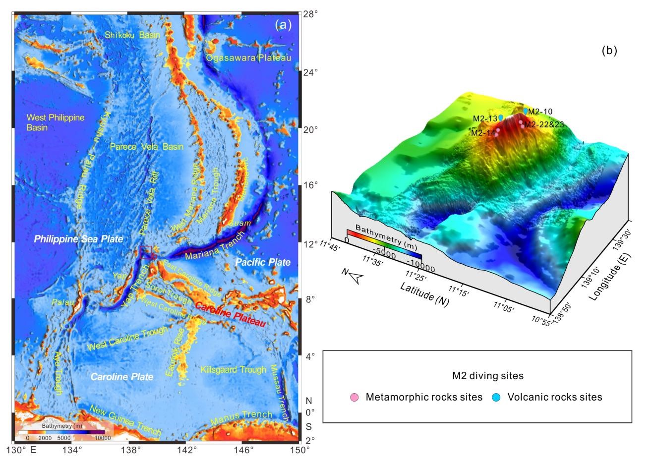 圖1 西太平洋海底地形和構(gòu)造背景示意圖(a);馬里亞納俯沖帶最南端的弧前區(qū)M2站位的火山巖和變質(zhì)巖樣品采樣位置圖(b)