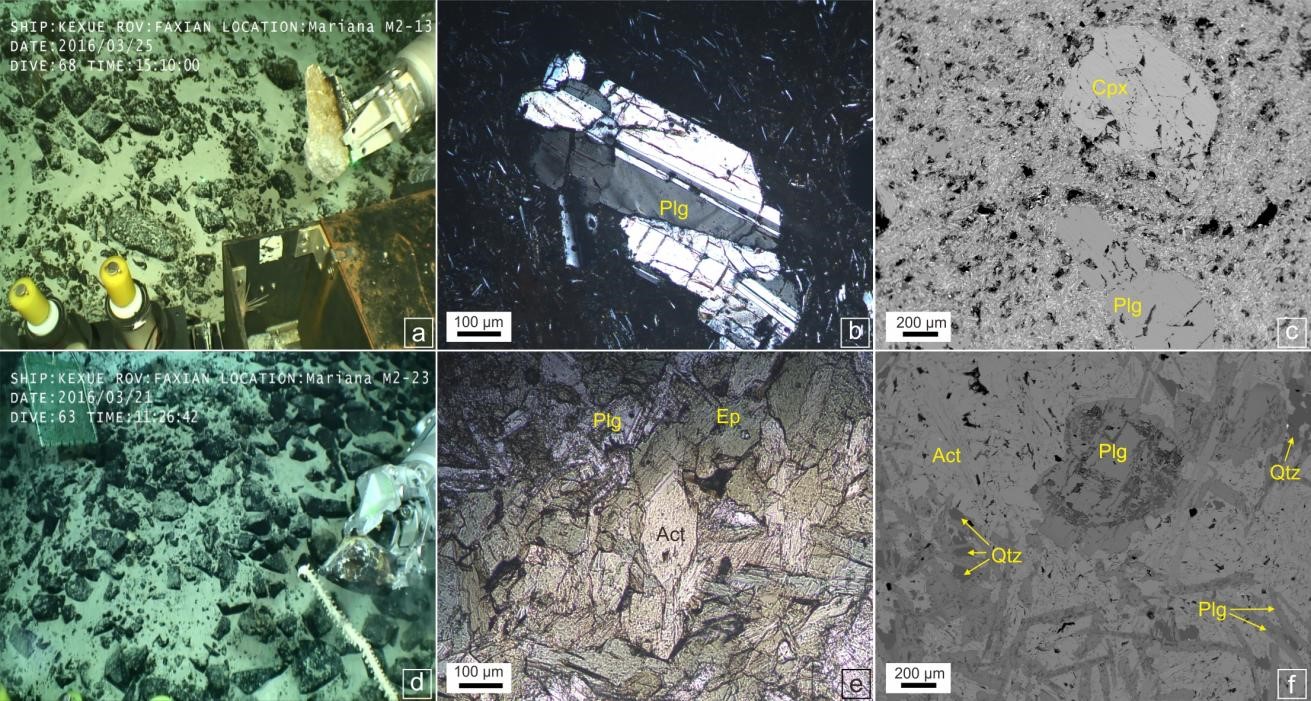 圖2 火山巖樣品(a-c)和變質(zhì)巖樣品(d-f)的海底采樣、微區(qū)礦物組成、和背散射照片