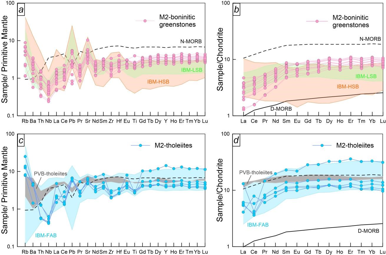 圖3 馬里亞納俯沖帶最南端M2站位的和玻安質(zhì)綠巖(a-b)和火山巖樣品(c-d)的微量元素蛛網(wǎng)圖和稀土元素配分形式圖