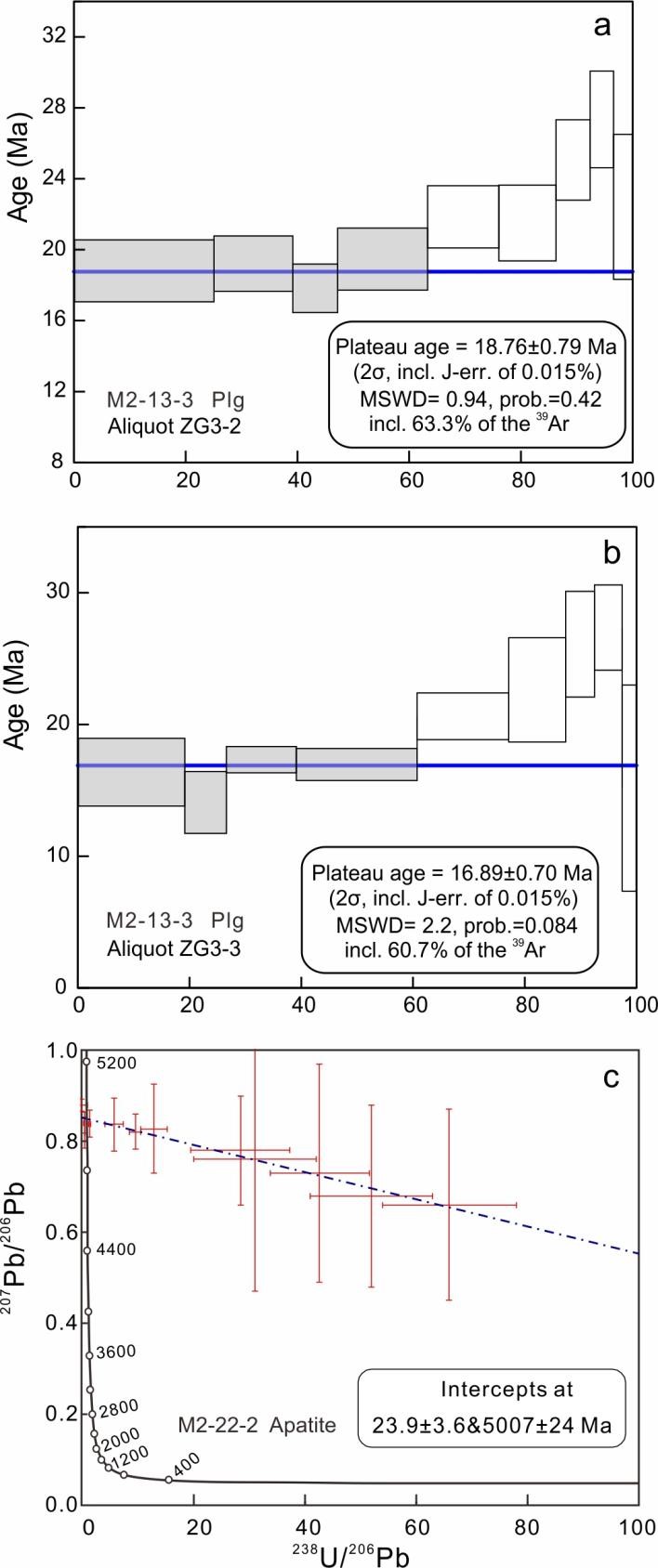 圖4 火山巖樣品(M2-13-3)的斜長(zhǎng)石Ar-Ar定年結(jié)果(a–b);變質(zhì)巖樣品(M2-22-2)的磷灰石U-Pb定年結(jié)果(c)