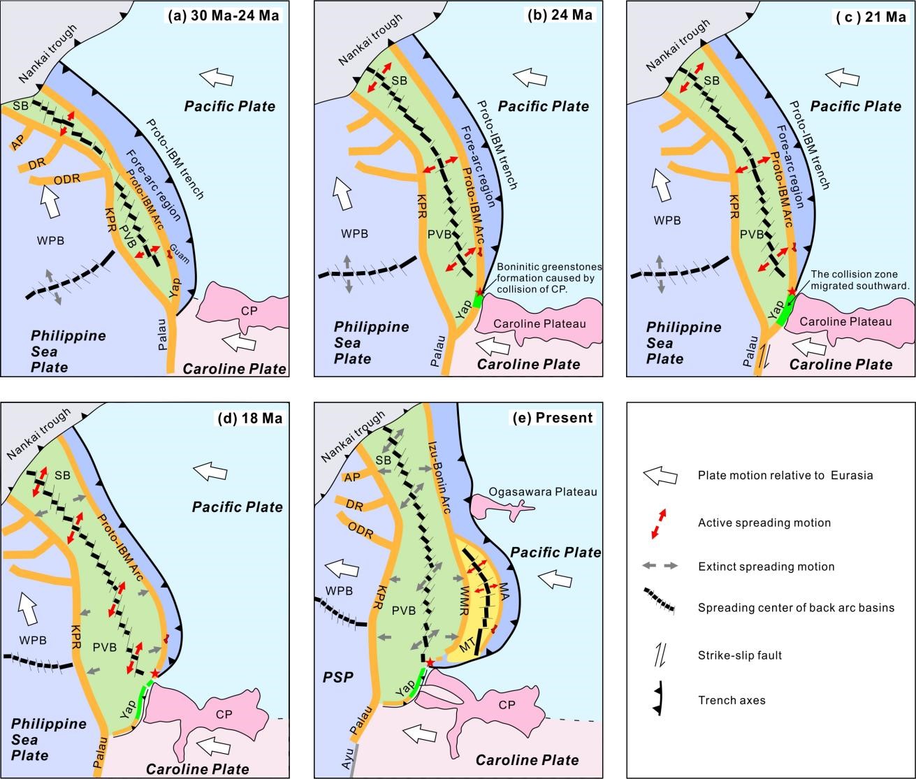 圖5 西南馬里亞納俯沖帶的構(gòu)造演化模型:碰撞前階段(a)、碰撞階段(b-c)和碰撞后階段(d-e)