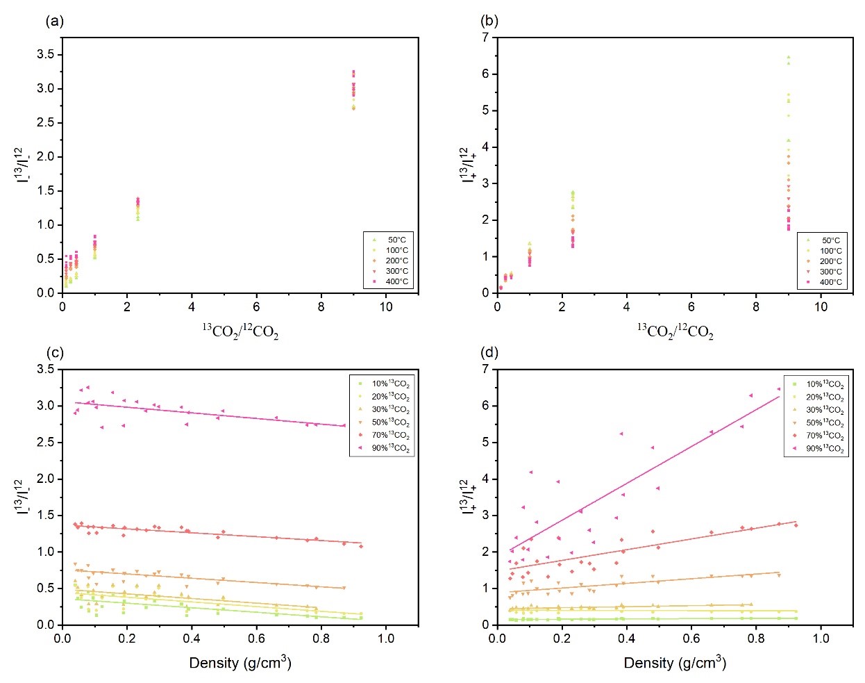 針對(duì)這一問題,張?chǎng)螆F(tuán)隊(duì)利用構(gòu)建的高溫高壓實(shí)驗(yàn)顯微模擬裝置,系統(tǒng)地研究了50-450 ,50-400 bar下高純13CO2、12CO2的拉曼光譜,對(duì)比了兩者峰位、峰寬隨溫度、壓力的變化(圖2)。在實(shí)驗(yàn)溫壓范圍內(nèi),13CO2和12CO2的特征峰的半峰寬均在2-5 cm-1,而兩者的峰位差卻可達(dá)15 cm-1以上,表明兩者在拉曼光譜中可以很好地通過特征峰的峰位進(jìn)行區(qū)分。進(jìn)一步地,研究團(tuán)隊(duì)通過對(duì)不同比例的混合氣的研究,探討了不同溫度、壓力下 13CO2和12CO2的拉曼特征峰的峰強(qiáng)比、面積比與兩者含量比的關(guān)系,并最終分別選取I+13/I+12、I-13/I-12為定量指標(biāo)建立起了可用于高溫高壓體系下CO2碳同位素組成(13CO2/12CO2)測(cè)定的拉曼定量校準(zhǔn)模型(圖3)。該定量方法的建立,為原位快速監(jiān)測(cè)同位素標(biāo)記的實(shí)驗(yàn)體系提供了有效檢測(cè)手段,并有望應(yīng)用于流體包裹體及深海熱液流體中CO2碳同位素的原位測(cè)試。