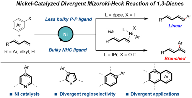 近日,中國科學院大連化學物理研究所精細化工研究室仿生催化合成研究組研究員陳慶安團隊在鎳催化1,3-共軛二烯選擇性芳基化方面取得新進展。團隊提出通過配體與添加劑的精準調(diào)控,高選擇性、高產(chǎn)率地得到直鏈與支鏈的Heck產(chǎn)物的新策略;并利用兩類產(chǎn)物,編程式地構建了一系列高度芳基化的產(chǎn)物。此外,團隊結(jié)合相關的機理研究提出了可能的催化過程。該方法也為廉價金屬催化的選擇性芳基化反應提供了新思路。