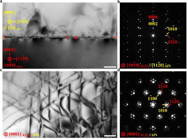 圖1. AlN/Al2O3 (0001)非共格界面的顯微結(jié)構(gòu)。(a, b) 截面樣品的透射電鏡明場(chǎng)像和選區(qū)電子衍射圖。AlN薄膜在Al2O3襯底上外延生長(zhǎng),界面上形成了明暗不均的襯度,表明界面上存在應(yīng)力集中。(c, d) 平面樣品的透射電鏡明場(chǎng)像和選區(qū)電子衍射圖。界面上形成了界面失配位錯(cuò)網(wǎng)絡(luò)。標(biāo)尺為200 nm。