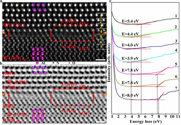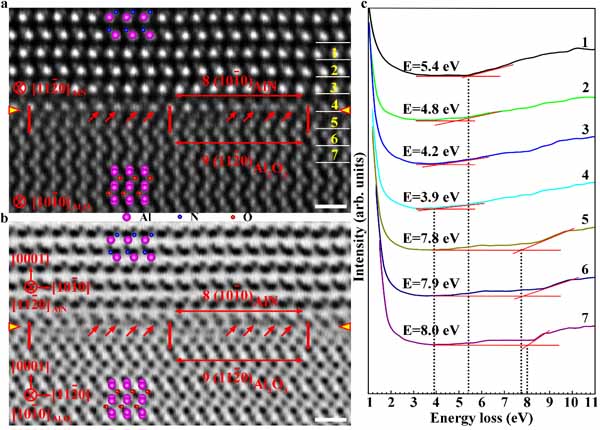 圖3. AlN/Al2O3界面層錯(cuò)區(qū)的原子與電子結(jié)構(gòu)。(a, b) 掃描透射電鏡HAADF像和ABF像。界面層錯(cuò)形成于Al2O3一側(cè),但層錯(cuò)沒有改變界面兩側(cè)材料的晶格匹配,界面上仍然是8個(gè)AlN的原子面匹配9個(gè)Al2O3的原子面。(c) 原子層分辨的價(jià)電子能量損失譜。界面的帶隙降低為~ 3.9 eV,顯著小于AlN和Al2O3體材料的帶隙。標(biāo)尺為5