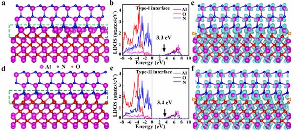 圖4. AlN/Al2O3界面原子與電子結(jié)構(gòu)的第一性原理計(jì)算。(a-c) 無層錯(cuò)區(qū)的原子模型、電子態(tài)密度和Al原子的差分電荷密度。(a-c) 層錯(cuò)區(qū)的原子模型、電子態(tài)密度和Al原子的差分電荷密度。無層錯(cuò)區(qū)和層錯(cuò)區(qū)的帶隙分別為3.3 eV和3.4 eV,界面上鍵合強(qiáng)度高,形成了畸變的AlN3O四面體和AlN3O3八面體,存在Al-N鍵和Al-O鍵的競(jìng)爭(zhēng)。