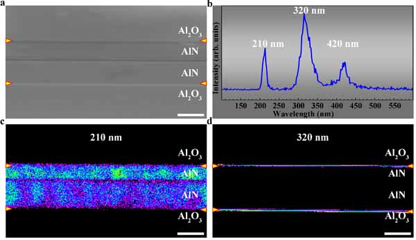 圖5. AlN/Al2O3界面的陰極熒光測(cè)量。(a) 掃描電鏡二次電子像,(b) 陰極熒光光譜,(c, d) 210 nm和320nm激光測(cè)得的陰極熒光分布圖。210nm光激發(fā)來自AlN薄膜,320nm光激發(fā)來自界面。界面發(fā)光強(qiáng)度顯著高于AlN薄膜的本征發(fā)光。標(biāo)尺為2 m。
