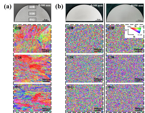 圖3 鍛造工藝優(yōu)化前后棒材晶體取向?qū)Ρ龋海╝)優(yōu)化前 300mm棒材低倍組織及其晶體取向;(b)優(yōu)化后 300mm和 550mm棒材低倍組織及其晶體取向