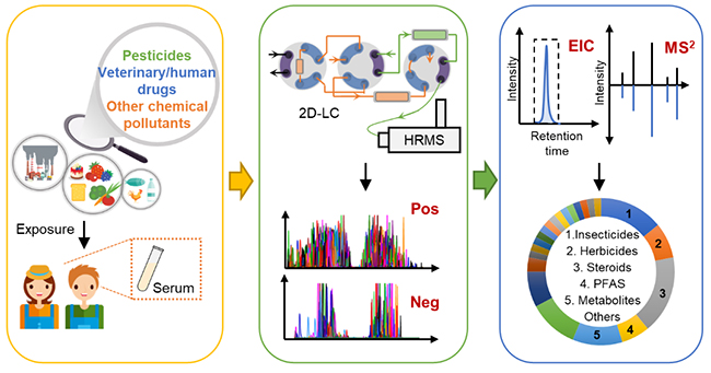 相關(guān)工作以“Screening strategy for 1210 exogenous chemicals in serum by two-dimensional liquid chromatography-mass spectrometry”為題,發(fā)表在《環(huán)境污染》(Environmental Pollution)上。第一作者是該組的博士生王宇婷。