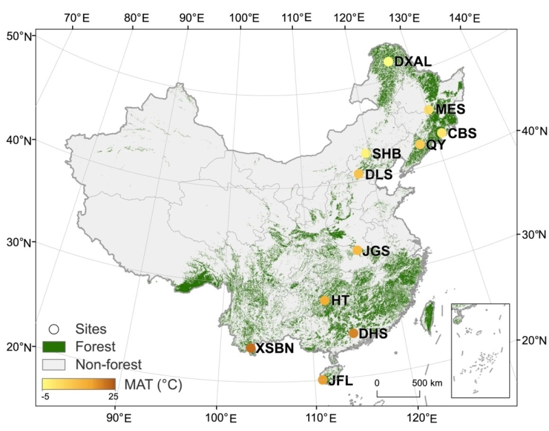 針對上述問題,中國科學(xué)院沈陽應(yīng)用生態(tài)研究所方運(yùn)霆研究員團(tuán)隊(duì)與中國科學(xué)院地理科學(xué)與資源研究所張揚(yáng)建團(tuán)隊(duì)等建立了15N標(biāo)記量化土壤N2O和N2產(chǎn)生速率的技術(shù),對中國18個森林土壤反硝化作用N2O和N2產(chǎn)生速率的溫度敏感性進(jìn)行了研究,探討了主要驅(qū)動因素,并利用生態(tài)系統(tǒng)過程模型(DyN-LPJ)結(jié)合室內(nèi)培養(yǎng)的溫度敏感性結(jié)果模擬了未來變暖情形下全球森林土壤反硝化作用氣態(tài)氮釋放的響應(yīng)。研究的18個森林站點(diǎn)從南到北相距4000km,緯度相差33 (圖1),覆蓋了廣泛的氣候梯度(年均溫相差25 C,年降水量相差2000mm)。