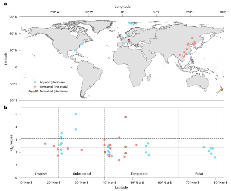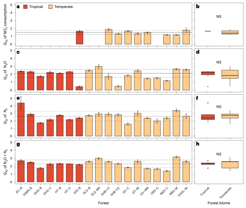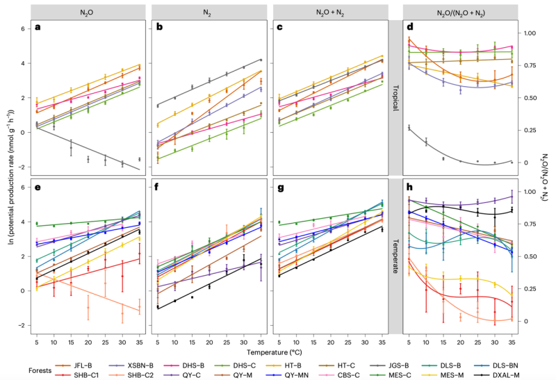 這項(xiàng)研究成果以“Universal temperature sensitivity of denitrification nitrogen losses in forest soils”為題于2023年6月22日發(fā)表在Nature Climate Change上(IF2021=28.66)。中國科學(xué)院沈陽應(yīng)用生態(tài)研究所于浩明博士生為第一作者,方運(yùn)霆研究員和中國科學(xué)院地理科學(xué)與資源研究所張揚(yáng)建研究員為共同通訊作者。合作者還有挪威生命科學(xué)大學(xué)Jan Mulder教授和Peter Dorsch教授、美國紐約州立大學(xué)朱偉興教授、中國科學(xué)院青藏高原研究所旭日研究員等。該研究受到國家重點(diǎn)研發(fā)計(jì)劃(2016YFA0600802)和中國科學(xué)院盧嘉錫國際團(tuán)隊(duì)項(xiàng)目(GJTD-2018-07)等項(xiàng)目資助。