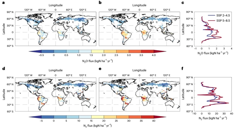 a-c和d-f圖分別為SSP2-4.5和SSP5-8.5情景模式下的氣態(tài)氮釋放模擬結(jié)果
