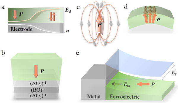 圖1. 鐵電疇的調(diào)控方式。(a)電極電荷屏蔽效應(yīng);(b)截止面的電荷失配效應(yīng);(c)缺陷偶極子與鐵電極化的靜電耦合效應(yīng);(d)撓曲電效應(yīng);(e)本工作提出的金屬/鐵電異質(zhì)界面肖特基勢壘效應(yīng)。