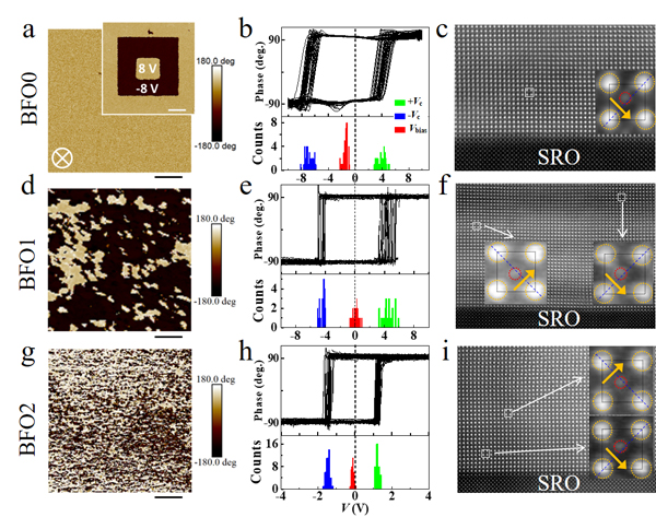 圖2. SrRuO3/(Bi,Sm)FeO3薄膜的自極化鐵電疇表征。(a),(d),(g)壓電力顯微鏡的相位圖;(b),(e),(h)單點壓電回線及矯頑電壓統(tǒng)計圖;(c),(f),(i)SrRuO3/(Bi,Sm)FeO3界面的高角度環(huán)形暗場像。