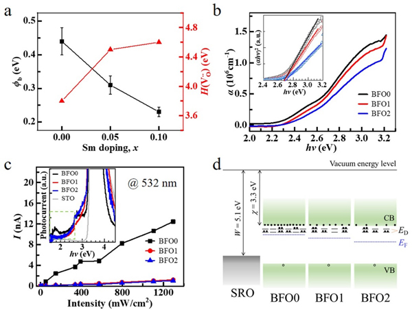 圖3. SrRuO3/(Bi,Sm)FeO3界面肖特基勢壘。(a)Sm摻雜調(diào)控界面勢壘(左軸)及BiFeO3中氧空位形成能(右軸);(b)(Bi,Sm)FeO3薄膜的吸光系數(shù)和光學(xué)帶隙;(c)(Bi,Sm)FeO3薄膜的光電流;(d)Sm摻雜調(diào)控BiFeO3費米能級示意圖。