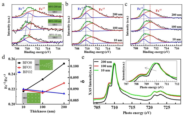 圖4. 不同薄膜厚度下氧空位的濃度與分布。(a)BiFeO3,(b)Sm0.05Bi0.95FeO3和(c)Sm0.1Bi0.9FeO3的X射線光電子能譜;(d)不同Sm摻雜BiFeO3薄膜的Fe2+/Fe3+濃度比值(左軸)及氧空位濃度BiFeO3- 值(右軸);(e)BiFeO3的X射線吸收譜。