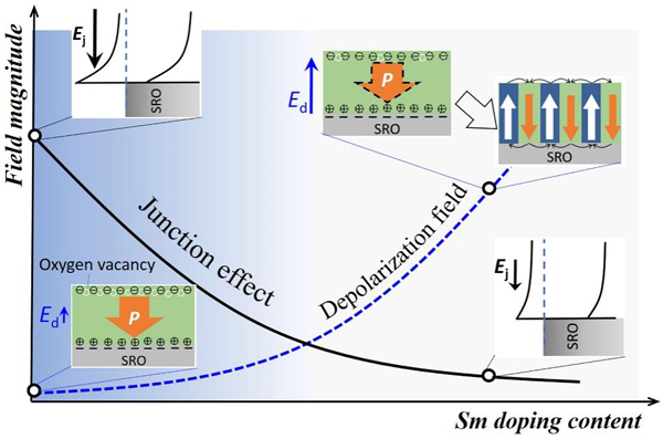 圖5. (Bi,Sm)FeO3薄膜鐵電自極化的調(diào)控機制。界面肖特基勢壘和退極化場的相互競爭導(dǎo)致鐵電多疇的形成。兩者均與氧空位濃度及其分布密切相關(guān)。