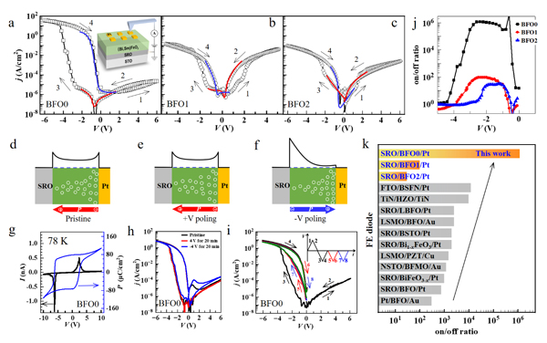 圖6. SrRuO3/(Bi,Sm)FeO3/Pt憶阻器的阻變翻轉(zhuǎn)行為。(a-c)I-V曲線;(d-f)BiFeO3二極管在初始態(tài)、極化向下態(tài),極化向上態(tài)的能帶結(jié)構(gòu)示意圖;(g)BiFeO3二極管在78 K下的I-V回線(左軸)及相應(yīng)的P-V回線(右軸);(h)電極化對BiFeO3二極管I-V阻變行為的影響;(i)不同電壓掃描過程對I-V阻變行為的影響;(j)SrRuO3/(Bi,Sm)FeO3/Pt器件的開關(guān)比;(k)各類鐵電二極管的開關(guān)比。