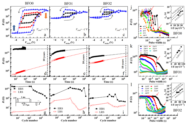 圖7. SrRuO3/(Bi,Sm)FeO3/Pt憶阻器的器件性能。(a-c)阻變記憶回線;(d-f)電阻保持性能;(g-i)電阻疲勞性能;(j-l)阻變翻轉(zhuǎn)動力學(xué)。