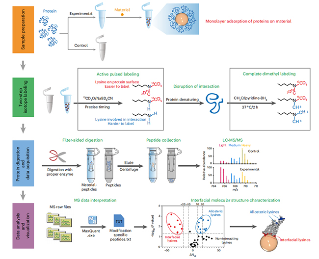 賴氨酸殘基通常定位于親水性蛋白質(zhì)表面,其側(cè)鏈伯氨基的化學(xué)標(biāo)記反應(yīng)性取決于其溶劑可及性和微環(huán)境非共價相互作用。當(dāng)?shù)鞍踪|(zhì)表面與微/納米材料結(jié)合時,結(jié)合界面上賴氨酸的溶劑可及性和反應(yīng)性都隨之降低。因此,王方軍等人提出了賴氨酸的反應(yīng)性變化是探測蛋白質(zhì)—微/納米材料復(fù)合體中蛋白質(zhì)定位方向、相互作用序列區(qū)域、關(guān)鍵結(jié)合位點、材料結(jié)合引起蛋白質(zhì)結(jié)構(gòu)變化的有效指標(biāo)。研究團隊發(fā)展了在蛋白質(zhì)—微/納米材料復(fù)合體活性和變性條件下的兩步同位素二甲基化標(biāo)記的標(biāo)準(zhǔn)化策略,結(jié)合質(zhì)譜定量分析實現(xiàn)蛋白質(zhì)上賴氨酸反應(yīng)性的全面分析,最后,通過材料結(jié)合前后賴氨酸標(biāo)記反應(yīng)性的顯著性差異確定蛋白質(zhì)—材料的界面序列區(qū)域和關(guān)鍵位點。
