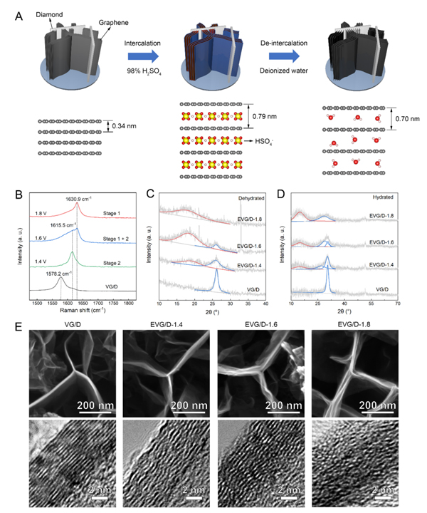 圖1. 層狀限域雙電層膨脹垂直石墨烯/金剛石薄膜電極的制備和表征:(A)制備流程示意圖;(B)石墨插層化合物的拉曼光譜;(C-D)XRD圖譜;(E)SEM和TEM圖像。