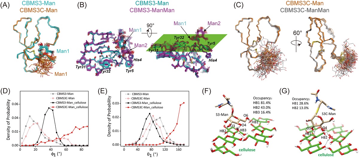 圖1 硫-糖基化與氧-糖基化所產(chǎn)生的結(jié)構(gòu)與動(dòng)力學(xué)差異導(dǎo)致了兩種糖基化對蛋白質(zhì)性質(zhì)的不同影響。(A-C)硫-糖基化的CBM(CBMS3C-Man和CBMS3C-ManMan)與氧-糖基化的CBM(CBMS3-Man和CBMS3-ManMan)的結(jié)構(gòu)差異。硫-糖基化的結(jié)構(gòu)所連接的糖基呈現(xiàn)柔性松散狀態(tài)而氧-糖基化的結(jié)構(gòu)所連接的糖基呈現(xiàn)為收斂的固定結(jié)構(gòu)。(D-F)分子動(dòng)力學(xué)模擬顯示結(jié)合纖維素底物后,硫-糖基化的CBM的糖基具有比O-糖基化的糖基更多的運(yùn)動(dòng)性和更少的氫鍵占有率,共同導(dǎo)致其結(jié)合底物能力變?nèi)酢?span>