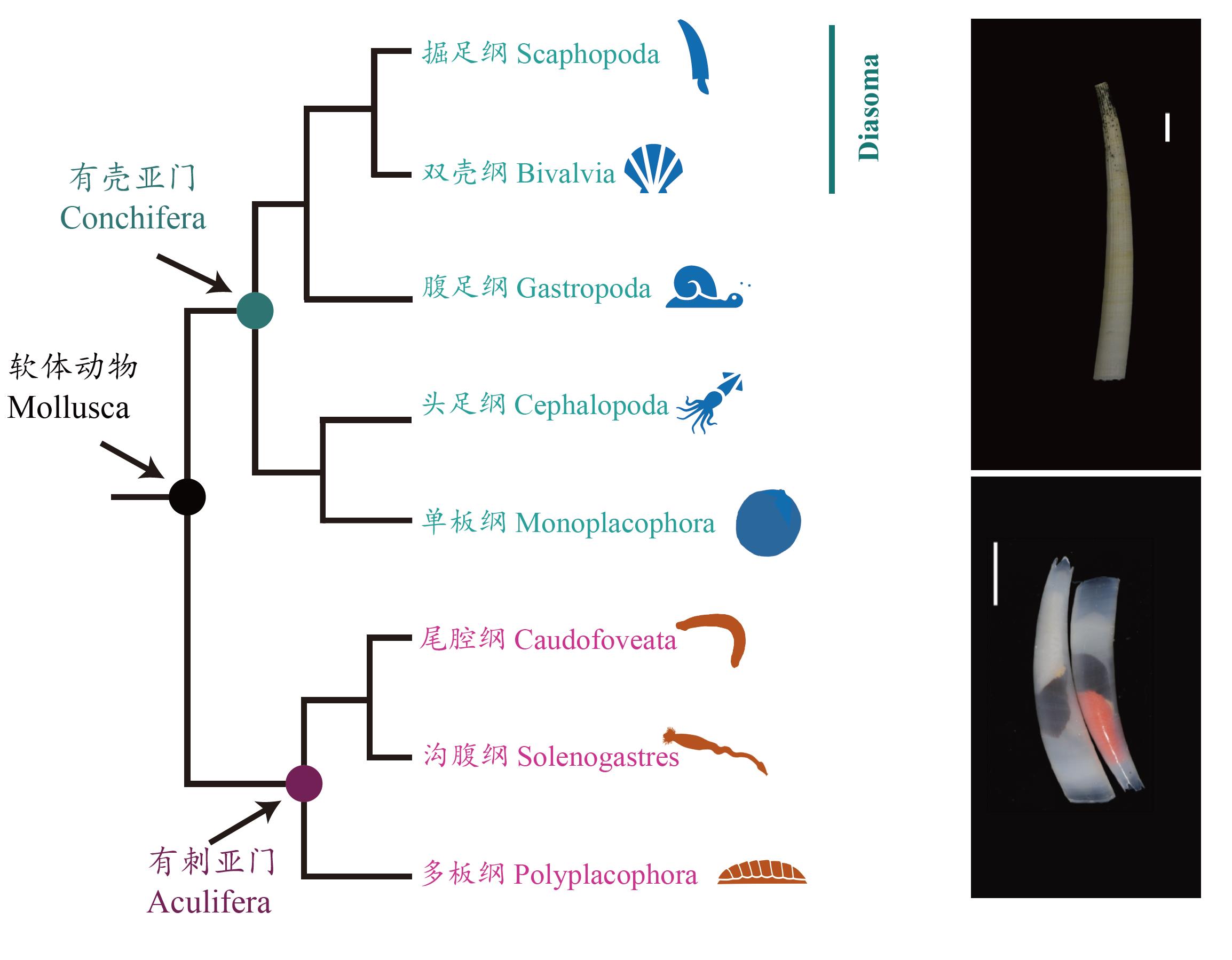 軟體動物門起源于寒武紀,是僅次于節(jié)肢動物門的第二大動物門類,也是海洋中種類最多的動物類群,分為8個綱:腹足綱(Gastropoda)、雙殼綱(Bivalvia)、頭足綱(Cephalopoda)、掘足綱(Scaphopoda)、單板綱(Monoplacophora)、多板綱(Polyplacophora)、溝腹綱(Solenogastres)和尾腔綱(Caudofoveata),各綱具有極其多樣的身體模式(body plan)。長期以來,基于古生物學、形態(tài)學和分子證據(jù)提出的軟體動物系統(tǒng)發(fā)育假說之間存在許多沖突,導致綱與綱之間的演化關系仍存在爭議,尤其是關于掘足綱的分類地位一直懸而未決。