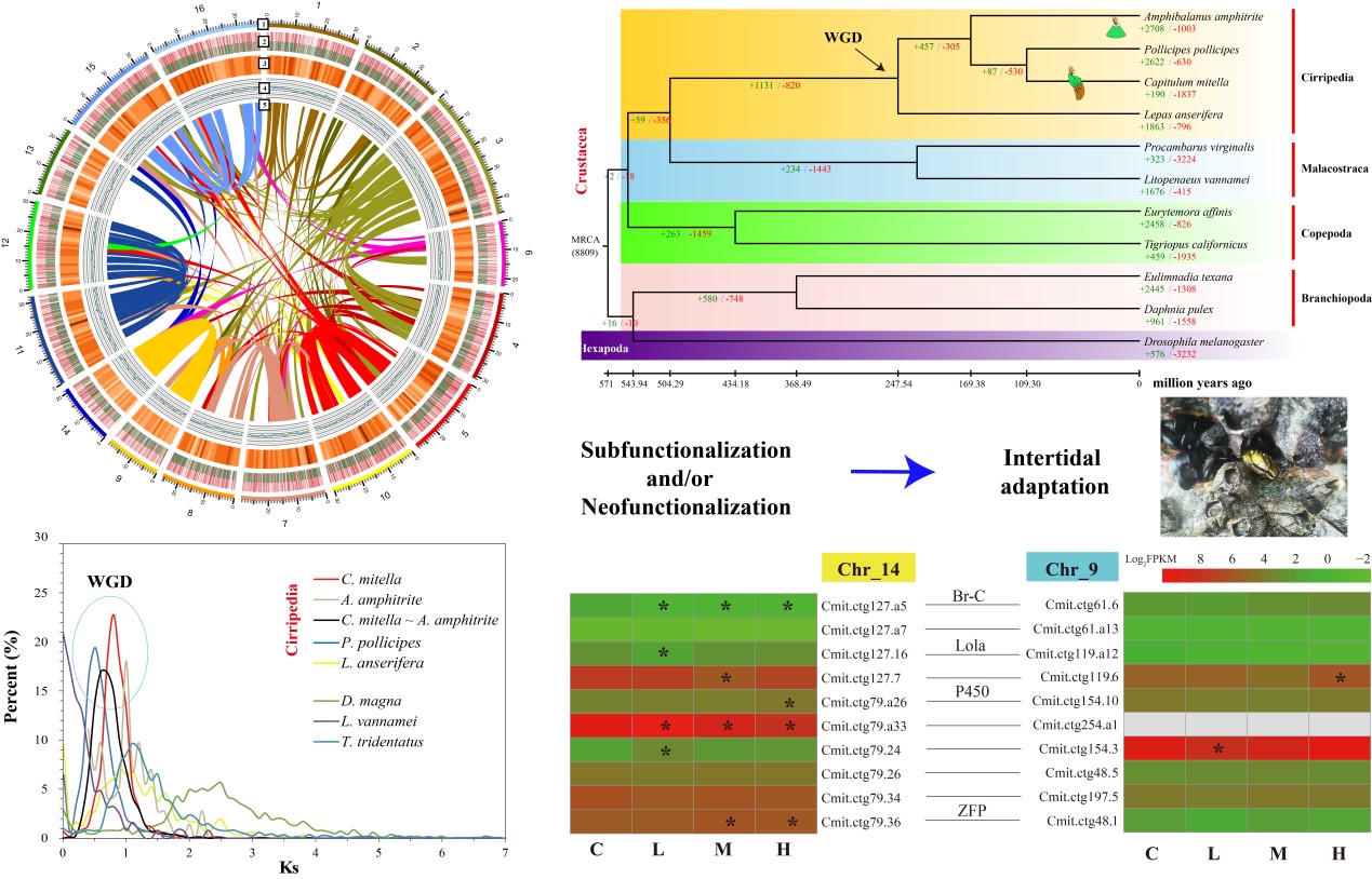 研究表明,新發(fā)現(xiàn)的這一WGD事件與蔓足類獨特的生物學(xué)表型和特殊生活習(xí)性的形成密切相關(guān)。由WGD產(chǎn)生的加倍的Hox基因Antp和Ubx與蔓足的形成密切相關(guān);而加倍形成的環(huán)境脅迫響應(yīng)因子——CYP450的新功能化或亞功能化與蔓足類潮間帶附著生長生活方式的適應(yīng)性進化密切相關(guān)。