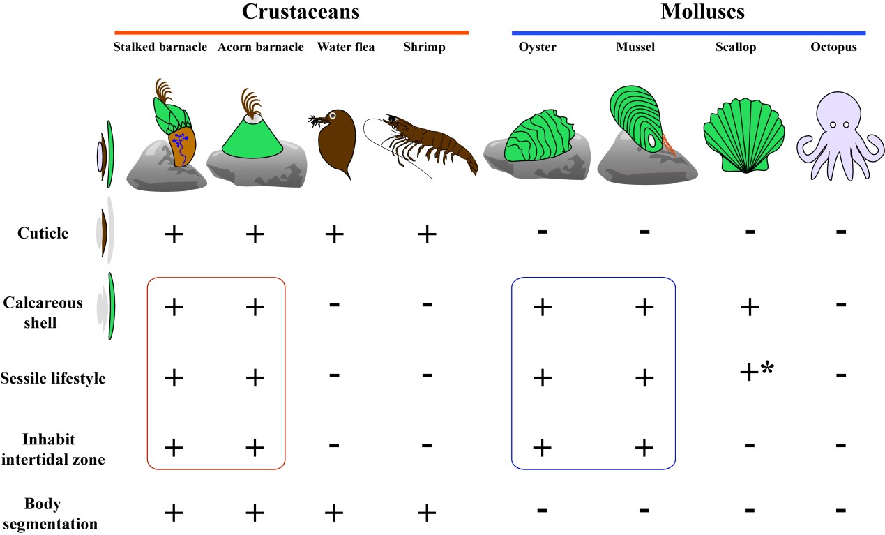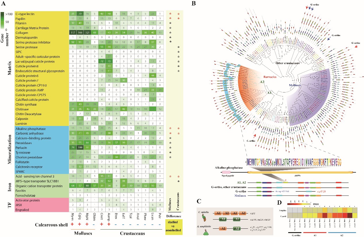 鑒于蔓足類和貝類等軟體動物具有極為相似的生物學(xué)表征,如鈣質(zhì)化外殼和附著生長生活方式,研究人員開展了蔓足類和貝類全基因范圍趨同進化的研究。比較基因組學(xué)分析發(fā)現(xiàn)蔓足類和貝類中大量鈣質(zhì)化外殼形成相關(guān)基因家族呈現(xiàn)趨同的擴張現(xiàn)象,包括兩類生物礦化關(guān)鍵基因:堿性磷酸酶(ALP)和碳酸酐酶(CA),以及部分基質(zhì)蛋白基因和離子運輸基因。這些基因的擴張均分別發(fā)生于蔓足類和貝類生物的祖先基因組上,與生物礦化的生物學(xué)機制形成時期(寒武紀(jì))接近,揭示了兩個類群的鈣質(zhì)化外殼可能起源于同一時期,而關(guān)鍵基因的新功能化促進了新表型的產(chǎn)生。與鈣質(zhì)化外殼形成不同,蔓足類和貝類附著生活方式的起源與新基因的產(chǎn)生有關(guān)。蔓足類顯著擴張的表皮蛋白可能是其獨特的一類基質(zhì)蛋白,揭示其鈣質(zhì)化外殼可能起源于其幾丁質(zhì)表皮系統(tǒng)。