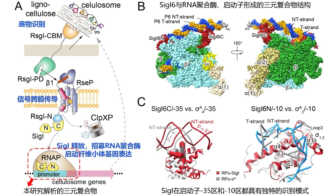 圖1. 通過結(jié)構(gòu)解析揭示SigI因子識別啟動子的機制。(A)SigI-RsgI通過感應底物調(diào)控纖維小體轉(zhuǎn)錄的機制。(B)包含SigI6的轉(zhuǎn)錄開放復合體的冷凍電鏡結(jié)構(gòu)。(C)SigI6對啟動子-35和-10區(qū)的識別方式。