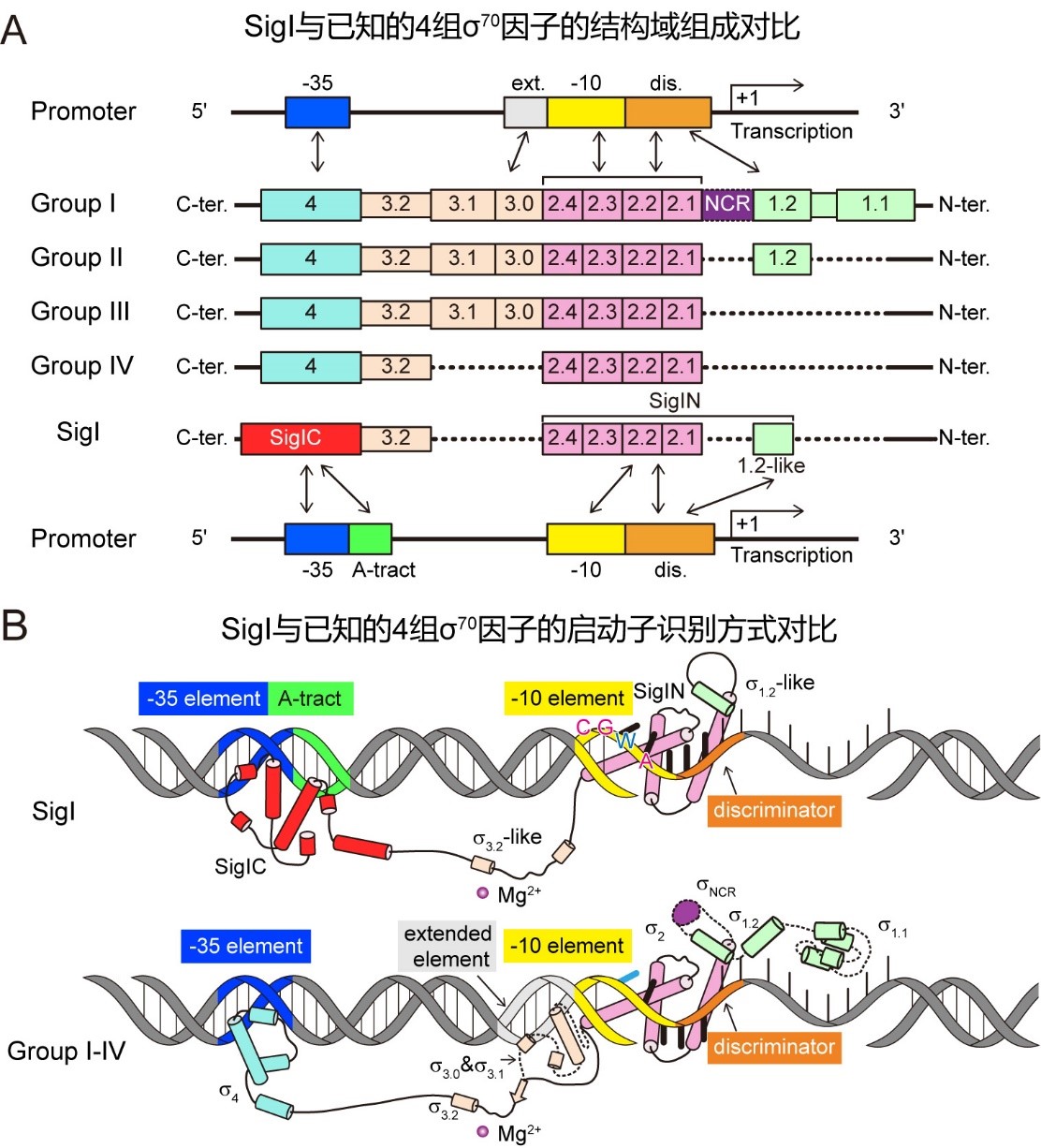 圖2 SigI因子具有和已知的4組 70家族 因子不同的結(jié)構(gòu)域組成和啟動子識別方式。