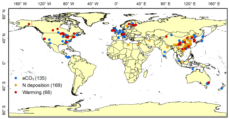 朱教君研究團隊前期通過在溫帶森林:遼寧清原森林生態(tài)系統(tǒng)國家野外科學觀測研究站(清原森林站)、吉林長白山森林生態(tài)系統(tǒng)國家野外科學觀測研究站(長白山站)、東北林業(yè)大學尖砬溝森林培育實驗站的研究發(fā)現(基于楊凱博士主持的優(yōu)青項目),叢枝菌根樹種具有相對易分解的凋落物,地表凋落層較薄;相反,外生菌根樹種具有相對難分解的凋落物,地表凋落物層較厚;土壤碳分布與凋落物碳變化則正好相反,但凋落物-土壤總的碳儲量為:以叢枝菌根樹種為主的林分高于以外生菌根樹種為主的林分達25%。上述研究結果的驅動機制是什么?即,森林菌根介導的植物-土壤的碳積累到底發(fā)生了怎樣的變化?針對上述問題,該團隊基于在清原森林站的監(jiān)測與研究結果,通過收集3050組全球變化背景下森林生物量、土壤碳及相關因子數據(圖1),并進行了系統(tǒng)分析,明確了氮沉降、二氧化碳倍增、增溫等全球變化因子對森林生態(tài)系統(tǒng)植物-土壤碳積累的影響,揭示了外生菌根和叢枝菌根植物-土壤碳分配策略對全球變化的響應規(guī)律。