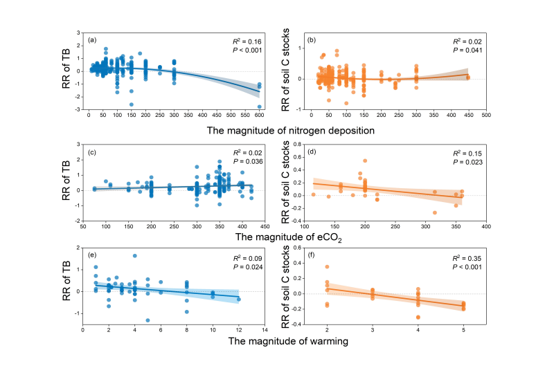 在氮沉降、二氧化碳倍增和增溫(全球變化因子)條件下,森林生態(tài)系統(tǒng)生物量增加了17.9%-31.4%。而土壤碳的變化與這些全球變化因子的關系則顯現出如圖2的變化:在二氧化碳倍增條件下,由于根系生物量、微生物活性等提高,森林生態(tài)系統(tǒng)土壤碳儲量增加了7.8%;而在氮沉降、增溫條件下,由于土壤酸化、激發(fā)效應等影響,土壤碳輸入-輸出達到平衡,森林生態(tài)系統(tǒng)土壤碳無顯著變化。上述結果量化了全球變化下森林生態(tài)系統(tǒng)植物-土壤碳的變化程度,揭示了全球變化因子調控的植物-土壤碳固持機制。