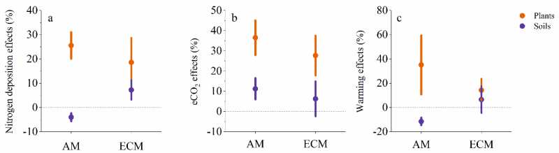 基于外生菌根和叢枝菌根樹種對養(yǎng)分的利用策略不同,以及菌根自身屬性對全球變化敏感性不同,進一步將森林劃分為以外生菌根樹種為主的森林和以叢枝菌根樹種為主的森林。研究發(fā)現,森林樹種菌根類型是調控植物-土壤碳固持的關鍵要素(圖3)。在氮沉降、增溫下,盡管森林土壤碳無顯著變化,但不同菌根樹種占主導的森林土壤碳發(fā)生了顯著變化,即叢枝菌根樹種占主導的森林土壤碳顯著降低,而外生菌根樹種占主導的森林土壤碳則顯著升高,且不同菌根樹種森林的植物-土壤碳二者之間存在著權衡關系;如,與外生菌根樹種占主導的森林生物量相比,叢枝菌根樹種占主導的森林生物量增加更多。上述結果為準確評估全球變化下森林生態(tài)系統(tǒng)碳積累提供了重要參考。