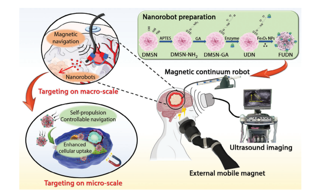 腦膠質(zhì)瘤是嚴(yán)重危害人類健康的惡性腫瘤,患者中位生存期不到15個月,目前臨床采用的治療手段包括手術(shù)治療、放化療和靶向治療等。其中,靶向治療面臨著由于血腦屏障的阻隔使得大部分藥物分子不能夠進(jìn)入腦組織的難題。中國科學(xué)院沈陽自動化研究所科研團(tuán)隊(duì)與中國醫(yī)科大學(xué)附屬盛京醫(yī)院合作,研制了一套子母式微納米機(jī)器人系統(tǒng),可經(jīng)顱骨微創(chuàng)通道進(jìn)入顱內(nèi),越過血腦屏障抵達(dá)膠質(zhì)瘤部位,將藥物精準(zhǔn)遞送到膠質(zhì)瘤病灶。該研究以Dual-Responsive Nanorobot-Based Marsupial Robotic System for Intracranial Cross-Scale Targeting Drug Delivery為題,發(fā)表在最新一期材料領(lǐng)域國際頂刊《先進(jìn)材料》(影響因子29.4)。