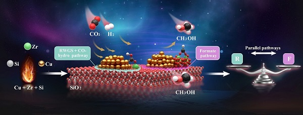 近日,中國科學(xué)院大連化學(xué)物理研究所氫能與先進(jìn)材料研究部碳資源小分子與氫能利用研究組研究員孫劍、副研究員俞佳楓團(tuán)隊與德國卡爾斯魯厄理工學(xué)院Anna Zimina博士等合作,利用火焰噴射裂解法(FSP)構(gòu)建了錨定在SiO2上的單位點(diǎn)Zr物種,該Cu/Zr-SiO2催化劑在CO2加氫制甲醇反應(yīng)中遵循“RWGS-CO hydro”路徑,與傳統(tǒng)的ZrO2納米顆粒上的“甲酸鹽”路徑并行存在,打破了單一反應(yīng)路徑上的動力學(xué)限制,所形成的雙通道反應(yīng)路徑是高效合成甲醇的關(guān)鍵。
