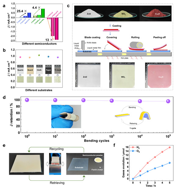 該液態(tài)金屬鑲嵌半導(dǎo)體顆粒的新型仿生人工光合成膜制備技術(shù)具有普適性好、膜結(jié)構(gòu)穩(wěn)定性高、易于規(guī)?;驮牧弦谆厥盏葍?yōu)勢。利用商業(yè)化半導(dǎo)體顆粒(如ZnO、WO3和Cu2O等)結(jié)合通用輥壓技術(shù),可實現(xiàn)不同半導(dǎo)體光活性薄膜在各種基體上的規(guī)?;苽洌@得的顆粒嵌入式薄膜的活性均顯著優(yōu)于傳統(tǒng)方法獲得的對照樣品。在柔性基體上集成的薄膜在大曲率彎折10萬次以上仍可保持95%以上的初始活性。此外,利用簡單的熱水超聲處理,即可將半導(dǎo)體顆粒、低溫液態(tài)金屬以及基體進(jìn)行分離回收再利用,且回收再集成制得的光活性薄膜表現(xiàn)出與原始薄膜近乎相同的活性(圖5)。