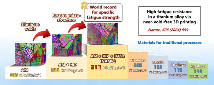 近期,中國科學院金屬研究所材料疲勞與斷裂團隊帶頭人張哲峰研究員在前期疲勞損傷機制和疲勞預測理論指導下,與輕質高強材料研究部楊銳研究員團隊開展合作,在3D打印鈦合金抗疲勞設計制備方面取得了突破性進展,制備出具有優(yōu)異疲勞性能的3D打印鈦合金材料。該項研究成果于2024年2月29日以題為“High fatigue resistance in a titanium alloy via near void-free 3D printing”發(fā)表在Nature雜志上,金屬所博士研究生曲展為論文第一作者,張振軍研究員、美國加州大學伯克利分校Robert O. Ritchie教授、張哲峰研究員為論文通訊作者。