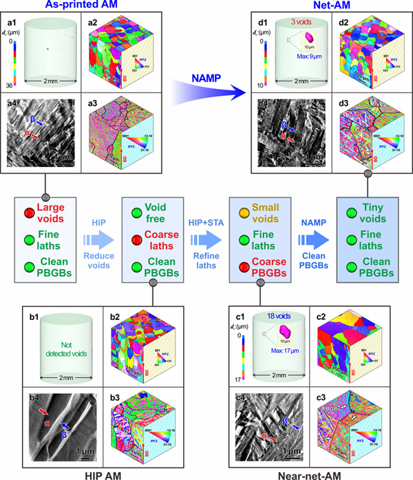 在文中,研究人員首次明確提出:理想狀態(tài)下3D打印技術直接制備出的鈦合金組織本身(稱為Net-AM組織)應具有天然優(yōu)異的疲勞性能,而打印過程中產生的氣孔等缺陷掩蓋了其自身組織抗疲勞的優(yōu)點,導致實際測量的3D打印材料疲勞性能大幅降低。因此,提升3D打印材料疲勞性能的關鍵在于消除打印氣孔的同時,盡可能保留原始打印的組織狀態(tài)。然而,目前消除氣孔的工藝往往伴隨組織粗化,而細化組織的處理又會帶來氣孔復現,甚至引發(fā)晶界 相富集等新的不利因素,可謂進退兩難。幸運的是,研究人員在Ti-6Al-4V合金中首次發(fā)現,高溫下3D打印態(tài)組織的晶界遷移及氣孔長大與相轉變過程表現出異步的特性;這意味著,存在一個寶貴的熱處理工藝窗口,既可實現板條組織細化,又能有效抑制晶界 相富集及氣孔復現。為此,研究人員巧妙地利用了這一工藝窗口,發(fā)明了缺陷與組織分步調控的NAMP新工藝(Net-Additive Manufacturing Process)(圖1),最終制備出幾乎無氣孔的近Net-AM Ti-6Al-4V合金。