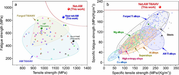 圖3. 本研究工作制備的Net-AM組織鈦合金的疲勞性能(R=0.1):(a) Net-AM組織鈦合金拉-拉疲勞強度與增材和鍛造鈦合金疲勞強度對比;(b)Net-AM組織鈦合金與其他材料的比疲勞強度對比。Net-AM組織鈦合金不僅在鈦合金中具有最高的疲勞強度,而且在所有材料中表現出最高的比疲勞強度。