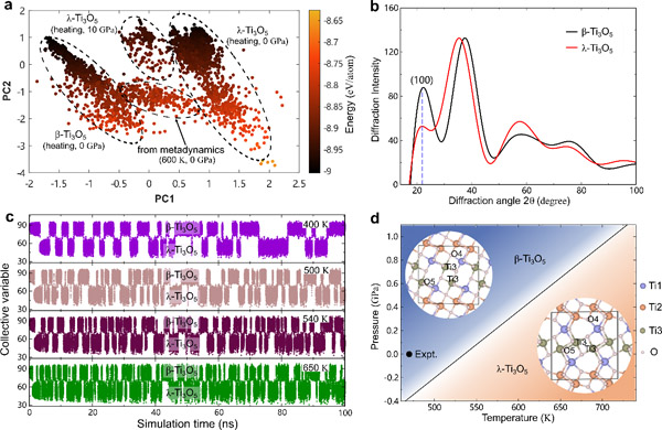 與位移型固固相變相比,重構(gòu)型相變因化學鍵斷裂而需要克服較大的自由能勢壘,常表現(xiàn)出緩慢的相變動力學。亞氧化鈦Ti3O5的 相與 相之間的轉(zhuǎn)變是一種典型的一階重構(gòu)型固固相變,然而卻表現(xiàn)出反常的超快可逆動力學特性。相變過程可通過施加壓力—熱、壓力—光以及壓力—電流等外部條件實現(xiàn)超快可逆調(diào)控,有望在光學存儲、能量存儲和傳感器等領(lǐng)域獲得應(yīng)用。但是,現(xiàn)有的實驗技術(shù)因缺乏足夠的空間和時間分辨率,很難捕捉到超快相變過程中的演化信息,而原子尺度模擬固固相變則需要大體系(超萬原子數(shù))、長時間尺度(納秒級別)動力學的精確描述。