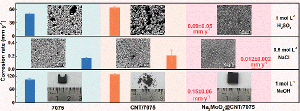 圖2. 高強(qiáng)高耐蝕7075鋁基復(fù)合材料優(yōu)異的耐強(qiáng)酸性、中性和強(qiáng)堿性介質(zhì)腐蝕性能